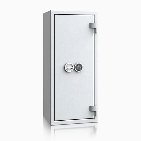 Przy wysokości 1150 mm jest to duży sejf wolnostojący, przeznaczony do ustawienia na podłodze, a nie w zabudowie meblowej. Wewnętrzne wymiary 1100 x 441 x 307 mm oraz dwie regulowane półki pozwalają wygodnie przechowywać do 18 segregatorów formatu A4, teczki, umowy, firmowe archiwa czy dokumenty księgowe. Duża pojemność 148 l sprawia, że bez problemu zmieścisz także gotówkę, biżuterię, nośniki danych, laptopy czy inne cenne przedmioty, które nie powinny pozostać „na widoku”.