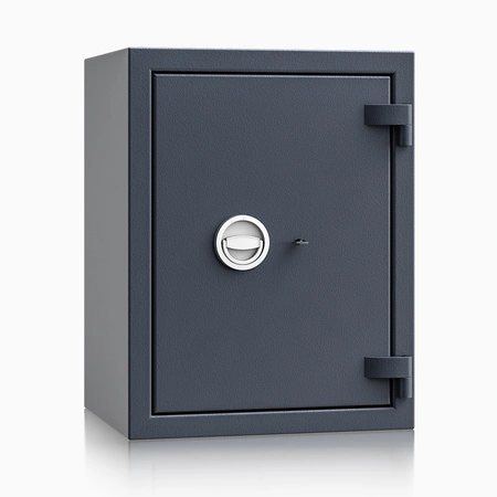 Sejf jest zamykany zamkiem kluczowym VdS Klasa I / IMP Klasa A, dostarczanym standardowo z trzema kluczami o długości 95 mm – rozwiązanie niezawodne, odporne na awarie zasilania i proste w obsłudze. Zewnętrzne zawiasy i kąt otwarcia drzwi 180° pozwalają szeroko otworzyć sejf, co ułatwia wkładanie segregatorów i większych przedmiotów. Otwory montażowe w dnie i tylnej ścianie umożliwiają trwałe kotwienie do podłoża lub ściany, co jest kluczowe zarówno dla bezpieczeństwa, jak i wymogów ubezpieczycieli. Grafitowy kolor (RAL 7024) sprawia, że sejf estetycznie wkomponuje się w większość nowoczesnych wnętrz biurowych i domowych.