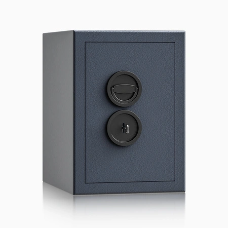Korpus o grubości 30 mm i drzwi 52 mm z czterostronnym ryglowaniem tworzą odporną na sforsowanie barierę, znacząco wydłużając czas ewentualnej próby włamania. Zamek kluczowy VdS klasy I dostarczany jest z dwoma kluczami o długości 65 mm, co zapewnia niezawodne zamykanie bez konieczności zapamiętywania kodów. Sejf posiada 2 otwory montażowe w dnie i 2 w ścianie tylnej, dzięki czemu można go trwale przykotwić do mebla lub ściany, uniemożliwiając szybkie wyniesienie. Grafitowy kolor (RAL 7024) sprawia, że sejf estetycznie komponuje się z nowoczesnymi wnętrzami.