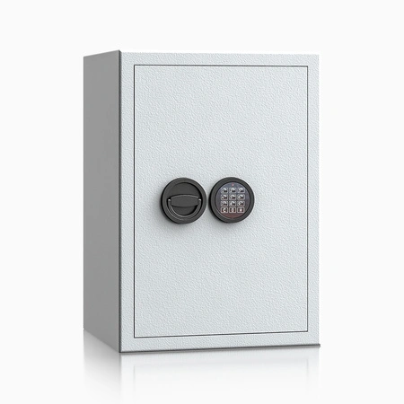 Model ISS Baden Baden 34102.02 oferuje pojemność 53 litrów i umożliwia wygodne ustawienie do 4 segregatorów formatu A4, co czyni go praktycznym rozwiązaniem dla domowego biura, kancelarii lub małej firmy. Dwuściankowy korpus o grubości 30 mm oraz wzmocnione, 52-milimetrowe drzwi z czterostronnym ryglowaniem stanowią skuteczną barierę przed próbą włamania. Szary kolor (RAL 7035) sprawia, że sejf dyskretnie komponuje się z typową zabudową meblową w gabinecie lub garderobie.