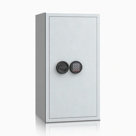 Sejf posiada 2 otwory montażowe w dnie i 2 w tylnej ścianie, co umożliwia solidne zakotwienie zarówno do podłoża, jak i do ściany – kluczowe dla bezpieczeństwa dużych sejfów. Waga 66 kg utrudnia wyniesienie urządzenia, a jednocześnie umożliwia montaż w standardowej zabudowie meblowej. Neutralny szary kolor RAL 7035 sprawia, że sejf dyskretnie wtapia się w biurową lub domową aranżację, nie zwracając na siebie uwagi osób postronnych.
