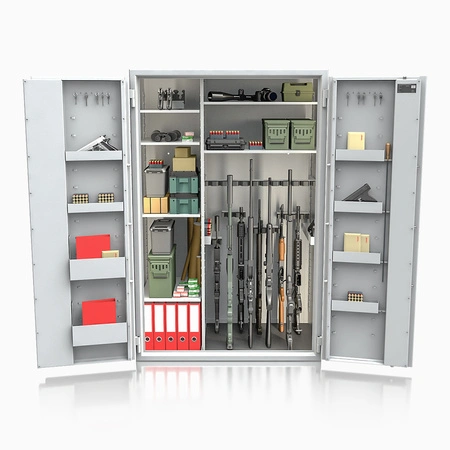 Dwa rzędy uchwytów na broń. Zastosowanie innowacyjnych przestawnych uchwytów na broń na szynie metalowej, mocowanej na magnes pozwala na umiejscowienie ich na dowolnej wysokości na ścianie tylnej czy na ścianach bocznych. Uchwyty na przestawnych szynach mają możliwość regulacji na wysokość i głębokość sejfu. Dla większej wygody użytkowej zastosowano podział szyny na broń. Dzięki temu zabiegowi, nawet najkrótsza broń będzie mogła być odpowiednio i bezpiecznie umieszczona w sejfie na broń. Uchwyty na broń mocowane na magnesach mogą służyć do ustawiania broni krótkiej.