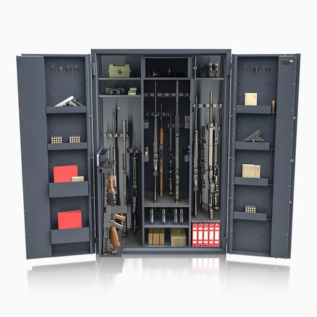 Dwa rzędy uchwytów na broń. Zastosowanie innowacyjnych przestawnych uchwytów na broń na szynie metalowej, mocowanej na magnes pozwala na umiejscowienie ich na dowolnej wysokości na ścianie tylnej czy na ścianach bocznych. Uchwyty na przestawnych szynach mają możliwość regulacji na wysokość i głębokość sejfu. Dla większej wygody użytkowej zastosowano podział szyny na broń. Dzięki temu zabiegowi, nawet najkrótsza broń będzie mogła być odpowiednio i bezpiecznie umieszczona w sejfie na broń. Uchwyty na broń mocowane na magnesach mogą służyć do ustawiania broni krótkiej.