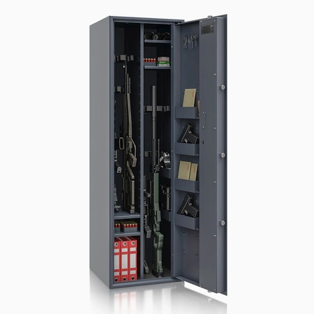 Wewnętrzna wysokość 1494 mm i głębokość 356 mm pozwalają wygodnie ustawić nawet wysoką broń długą z optyką. Szafa na broń długą pomieści do 12 jednostek – dzięki dwóm rzędom przestawnych uchwytów i środkowej przegrodzie możesz równolegle przechowywać broń myśliwską, sportową oraz amunicję i osprzęt. Cztery przestawne półki wewnątrz, cztery półki na drzwiach z uchwytem na wycior oraz dwa zawieszane pojemniki pomagają utrzymać porządek nawet przy rozbudowanym arsenale.