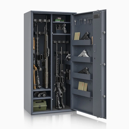 Model Siegen 500081.53 został zaprojektowany tak, aby łatwo dopasować wnętrze do długości broni i sposobu jej użytkowania. Centralna przegroda porządkuje układ sejfu, a cztery przestawne półki pozwalają oddzielić broń od amunicji, optyki, dokumentów czy środków do konserwacji. Dzięki temu nie trzeba wybierać między pojemnością a wygodą codziennego korzystania.