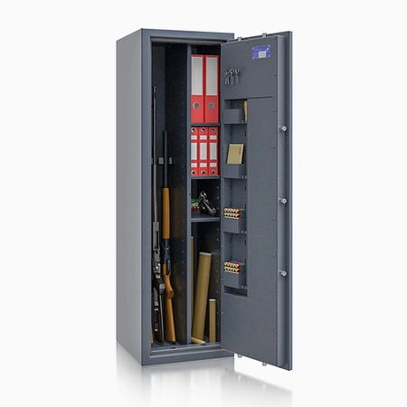 Szafa na broń i amunicję St. Gallen WF MAX Kombi 56474.53 to solidna szafa na broń długą w klasie odporności I, wyposażona w zamek kluczowy. Zapewnia wysoki poziom ochrony broni myśliwskiej i amunicji w domu lub mieszkaniu, łącząc bezpieczeństwo, wygodny układ wnętrza oraz możliwość kotwienia do podłoża lub ściany.