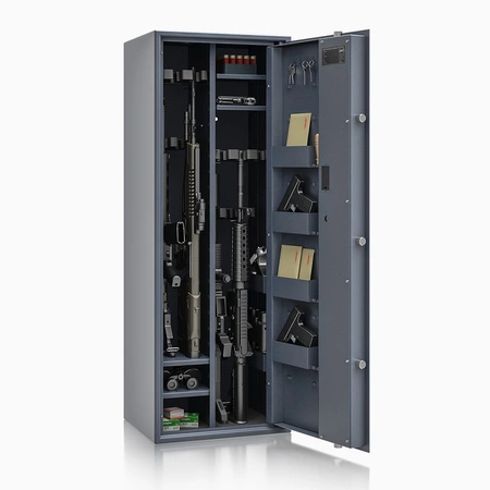 Szafa na broń i amunicję Siegen MAX KOMBI 12/125 S1 to nowoczesny sejf na broń długą z elektronicznym zamkiem, zaprojektowany do bezpiecznego przechowywania broni myśliwskiej i sportowej w domu lub mieszkaniu. Konstrukcja stalowa w klasie S1 z certyfikatem IMP spełnia wymagania polskich przepisów dotyczących przechowywania broni i amunicji.