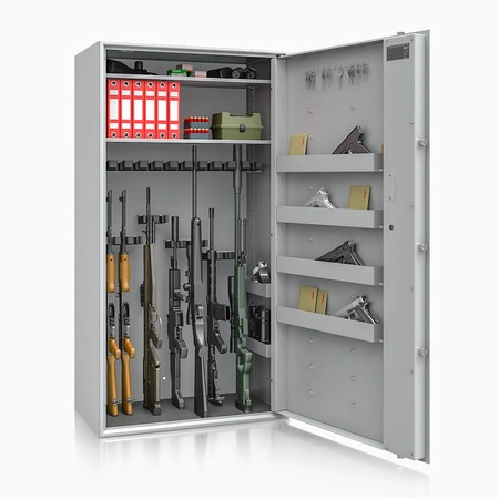 Poprzez możliwość przestawiania na wysokości półek jak i uchwytów na broń – można dowolnie spersonalizować wnętrze umożliwiając dogodne ustawienie broni o różnej wysokości.