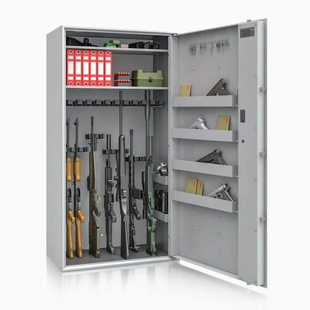 Poprzez możliwość przestawiania na wysokości półek jak i uchwytów na broń – można dowolnie spersonalizować wnętrze umożliwiając dogodne ustawienie broni o różnej wysokości.